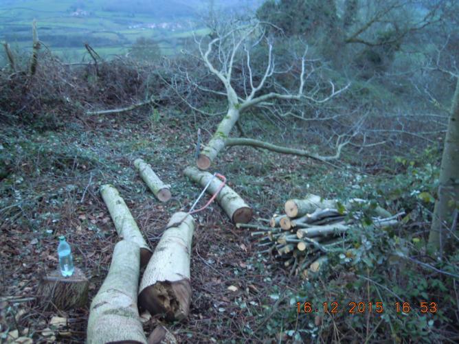 mercredi 16 décembre 2015,il fait très doux,12°C, je vais au bois à pied sur mon nouveau chantier au lieu dit "les roches".Voici les noyers que nous avons abattu ce WE.Cet après midi je débite celui de gauche.