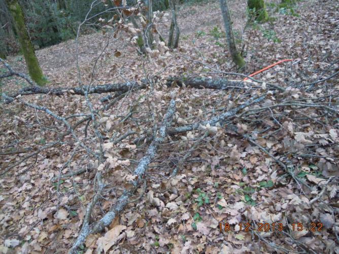 Mercredi 18 décembre 2013,cet après midi je vais au bois à bicyclette.Il fait très doux,environ 10°C et le ciel est un peu nuageux.Aujourd'hui je trie les brondes pour récupérer un maximun de bois pour faire des fagots.Je débite des branches de chêne cassées par le poids de la neige que j'empile sur le quatrième tas de bois.