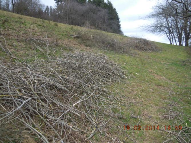 Mercredi 19 février 2014,cet après midi je vais au bois à pied,il fait doux et le ciel est très voilé.C'est presque la fin de la haie de frênes au lieu dit "le bernachon".Voici les trois tas de brondes qu'il me reste à trier pour garder ce qui me servira à faire des fagots pour allumer le feu.