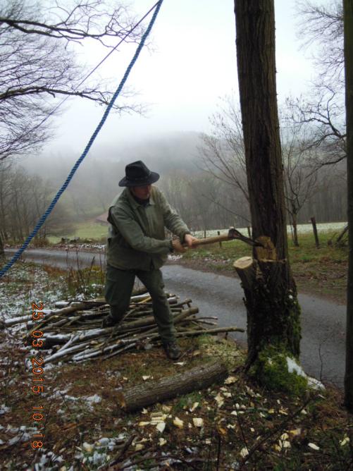 Allez,encore quelques coups et ce sera bon,il restera à faire le trait de scie à l'opposé et tirer sur la corde pour faire tomber l'arbre.